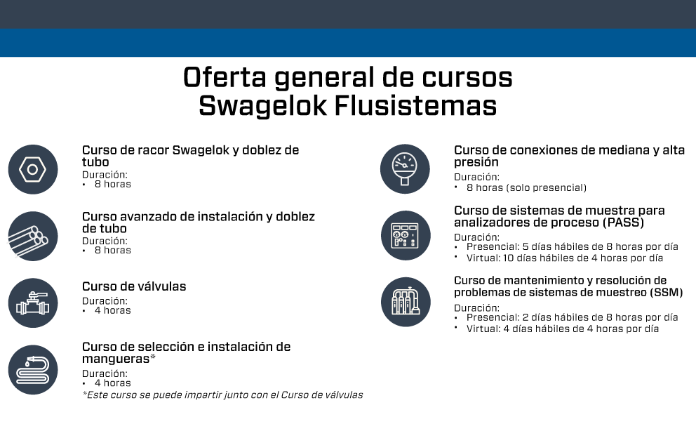 Swagelok Flusistemas ofrece cursos de formación para cualquier profesional de la industria que requiera ampliar sus conocimientos técnicos y prácticos relacionados con el diseño, operación y mantenimiento de sistemas de fluidos y de muestreo. Cada curso es impartido por instructores certificados por Swagelok Co. y cuentan con una amplia experiencia para enseñar desde los conceptos básicos hasta las últimas tecnologías y buenas prácticas.